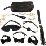 Set de 5 piese pentru o placere totala: masca, catuse, glezne, sfoara si bici. Negru. Dildo nu este inclus!