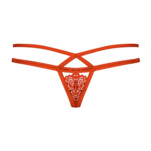 Chilotei de la Obsessive din dantela elastica si barete subtiri . Culoare: rosu. Marime: S/M. Produsul este ideal pentru un cadou elegant fiind impachetat in cutia originala! Transformă-ți apariția cu acest tanga roșu fermecător – secretul pentru un posterior absolut fantastic! Acest tanga roșu, delicat și seducător, este creat pentru a-ți accentua formele și pentru a aduce un plus de senzualitate fiecărei apariții. Detalii care atrag toate privirile: Design încântător: Tanga din dantelă, de un roșu intens, este decorat cu o fundă delicată și un pandantiv strălucitor, adăugând o notă rafinată. Croială ispititoare: Decupajul atrăgător pune în valoare formele și adaugă o notă irezistibilă. Benzi duble: Straps-urile duble îmbrățișează șoldurile, accentuând senzual curbele și adăugând un strop de îndrăzneală. Material elastic și confortabil: Fabricat dintr-un amestec de 90% poliamidă și 10% spandex, acest tanga este plăcut la atingere și se mulează perfect pe corp. Acest tanga roșu din dantelă este alegerea perfectă pentru a-ți pune în valoare frumusețea naturală și pentru a-ți surprinde partenerul cu o imagine seducătoare și de neuitat.