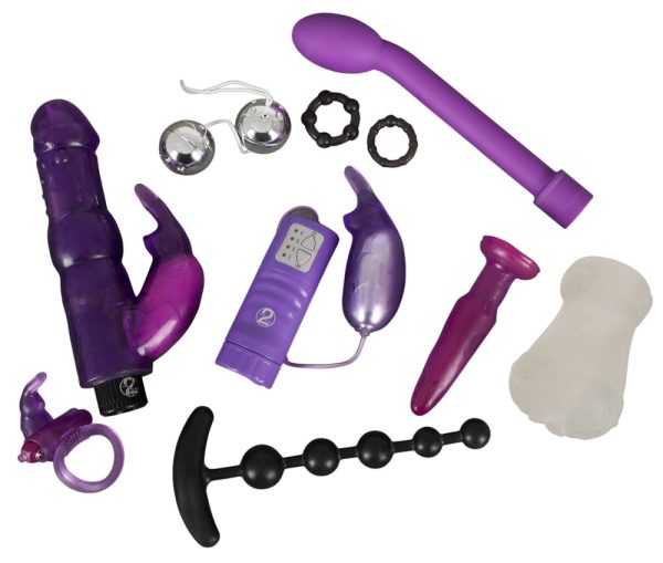 Pentru sex solo sau momente fierbinti cu partenerul! Nicio fantezie erotica nu ramane neimplinita cu acest set de placere din 10 piese!Setul include:Vibrator punctul G Multispeed. (Lungime totala 20.7 cm, lungime inserabila 18 cm, diametru 1.9 – 3.5 cm);Glont vibrator in forma de iepure, 4 moduri vibratii, include telecomanda. (Lungime totala 11 cm, diametru 1.2 – 3.5 cm, lungime cablu 77 cm);Margele anale negre cu 5 margele unite intre ele. (Lungime totala 18 cm, lungime inserabila 16.5 cm, diametru 0.6 – 2.5 cm); Inel de penis, gri cu 5 margele. (Diametru interior 2.3 cm (foarte flexibil), grosime 5 mm);Inel penis, gri cu 9 margele. (Diametru interior 2.3 cm (foarte flexibil), grosime 5 mm);Masturbator texturat pe interior. (Lungime totala 10 cm, diametru foarte flexibil);Bile vaginale. (Diametru bila 3.4 cm, lungimea cordonului de retractare 9.5 cm);Dop anal mov, flexibil. (Lungime totala 11 cm, lungime inserabila 9.5 cm, diametru 1.8 – 2.5 cm);Inel penis cu un stimulator de clitoris in forma de iepure si un glont vibrator detasabil (functie ON/OFF). (Lungime stimulator clitoris 5.5 cm, lungime glont 5 cm, diametru interior inel 3 cm (foarte flexibil), grosime 5 mm);Vibrator cu un brat de stimulare a clitorisului in forma de iepure si o structura stimulatoare pe ax, Multispeed. (Lungime totala 19.5 cm, lungime inserabila 13 cm, diametru 3.1 – 4.3 cm).Ia-ti acum acest set senzational si experimenteaza o placere pura!Material: ABS, TPE, PVC, poliamida.Include 2 baterii LR41, dar nu include 6 baterii AA.