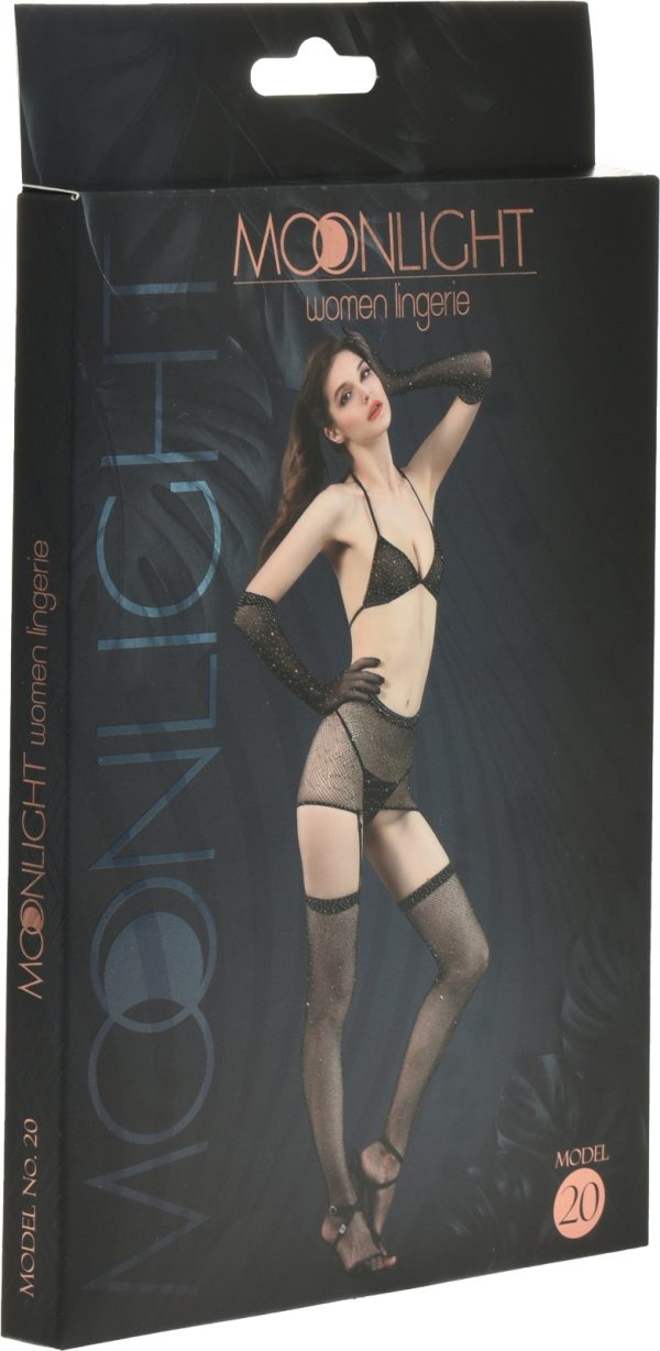 Set de lenjerie sexy, negru din plasa de tip fishnet cu cristale multicolore aplicate, in care pur si simplu vei straluci si vei atrage toate privirile.Setul este compus din:manusi lungi, cu degetesutien cu cupe triunghiulare, care se leaga la spate si dupa gat cu bretele elasticebikiniportjartier tip fusta, cu jartiere reglabileciorapi cu banda elasticaMaterial: 88% Nailon, 12% Elastan.